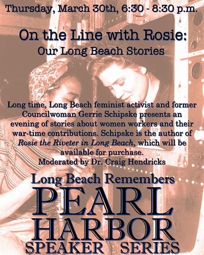 Longtime Long Beach feminist activist and former councilwoman Hon. Gerrie Schipske presents an evening of stories about local women workers and their role in World War II. Schipske is the author of Rosie the Riveter in Long Beach, which will be available for purchase. The discussion will be moderated by retired professor of history at LBCC and CSULB, Dr. Craig Hendricks. The discussion expands upon an Historical Society of Long Beach exhibition, Long Beach Remembers Pearl Harbor. The program is free to the public and ADA accessible. Visit http://hslb.org/visit/programs for more details.