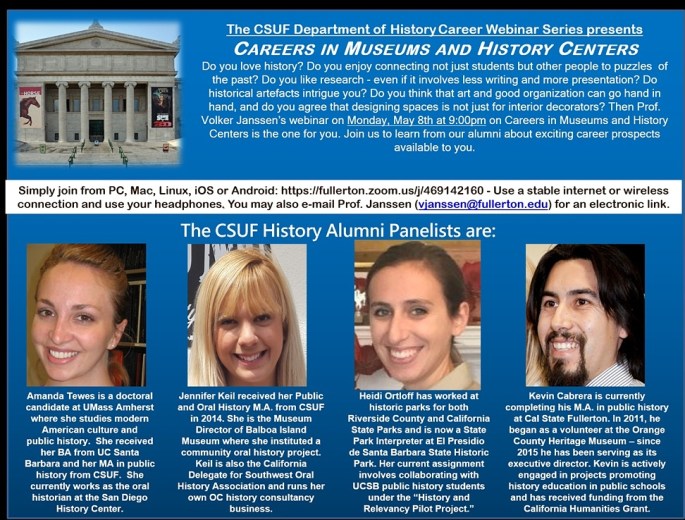 Join the CSUF alumni tonight for this Careers in Museums and History Centers webinar! San Diego History Center Oral Historian, Amanda Tewes, will share her experiences. The SOHA California Delegate, Jennifer Keil, will share about the oral history program at Balboa Island. Heidi Ortloff, of the California State Parks, has been collaborating with UCSB. Kevin Cabrera of the OC Heritage Museum with explain the education programs.
