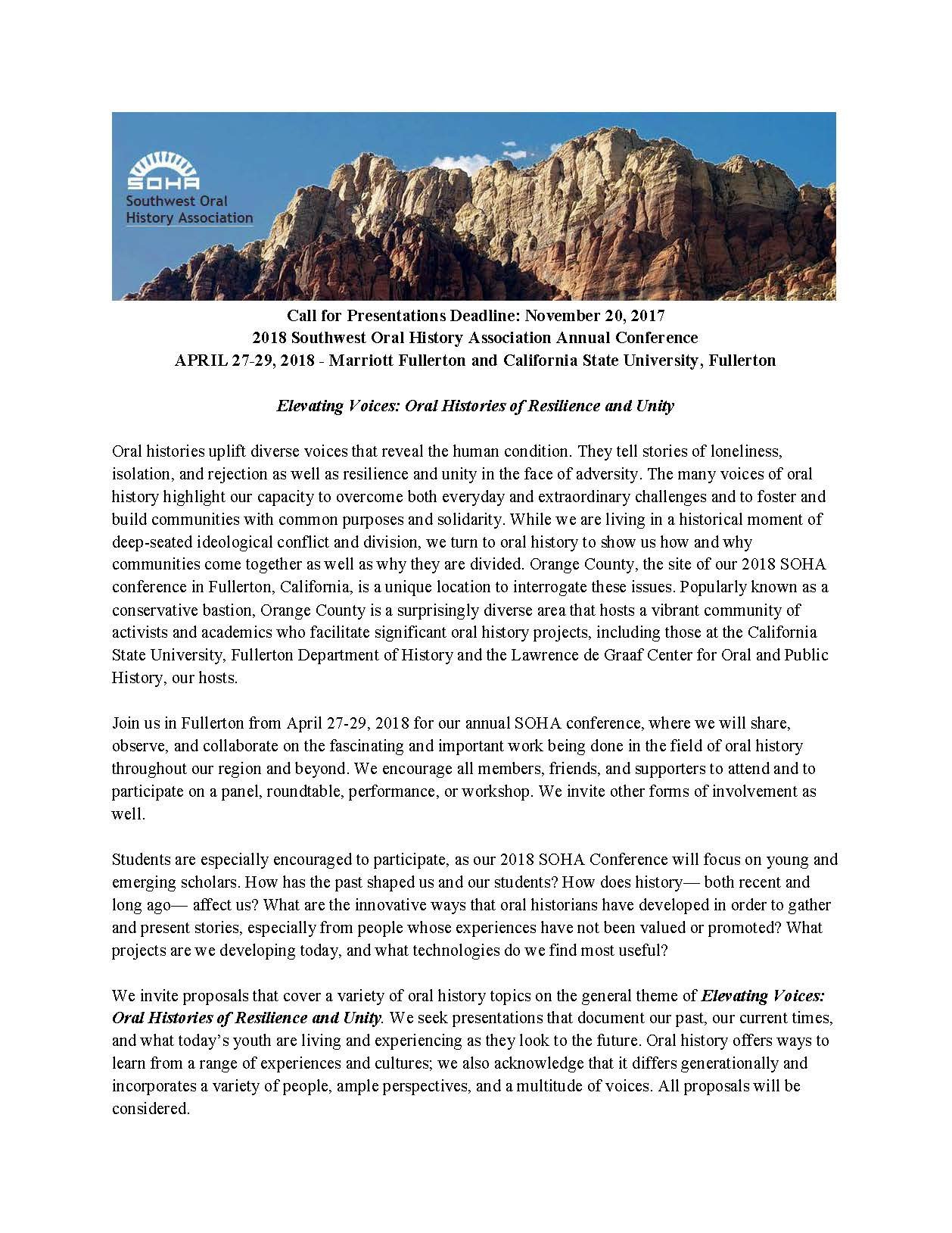 The Southwest Oral History Association is excited to announce our 2018 Call for Proposals. This year’s theme is, “Elevating Voices: Oral Histories of Resilience and Unity.” The Call for Presentations Deadline: November 20, 2017. The SOHA Annual Conference will take place APRIL 27-29, 2018 at the Marriott Fullerton and California State University, Fullerton. Please visit southwestoralhistoryassociation.org for more details.