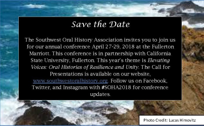 Join us for the 2018 SOHA Conference in Fullerton, California! Visit southwestoralhistory.org for the Call for Presentations and more details.