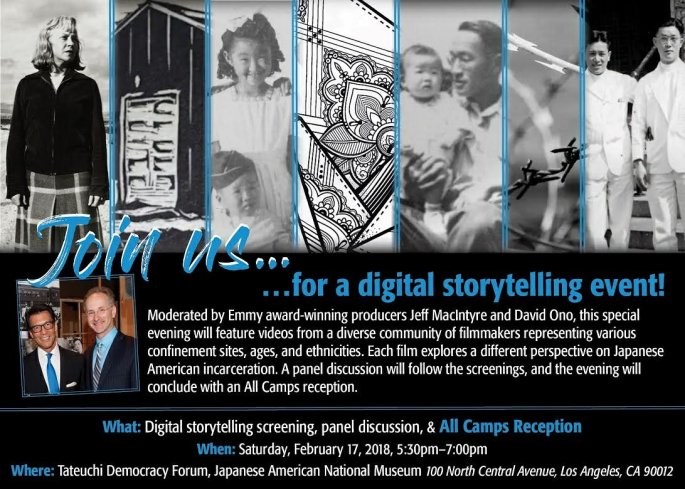 Join the Heart Mountain Wyoming Foundation and the Japanese American National Museum on Saturday, February 17 at 5:30pm in downtown LA. They are hosting a digital storytelling event. It’s free and open to the public, but you will need to RSVP via bit.ly/2Ea5elR.