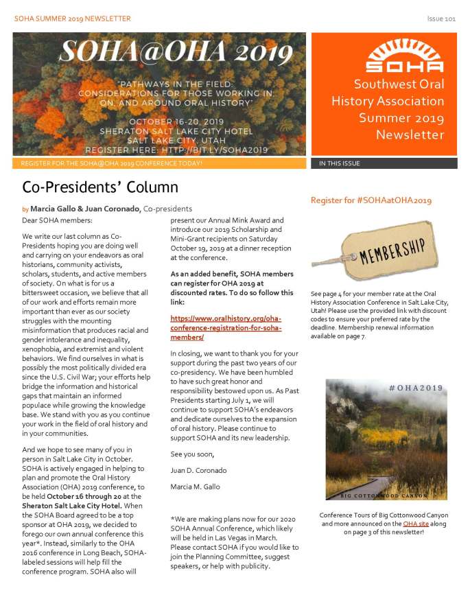 We hope you enjoy our SOHA Summer 2019 Newsletter! You can share it with family and friends with our social media accounts. Learn more about our upcoming conference with the Oral History Association in Salt Lake City, Utah October 16-20, 2019. Our members receive a special rate, so please renew your membership today. Visit http://bit.ly/SOHA2019 for registration details. There’s still time to submit a poster, so consider participating in this year’s program. You will want to register for the conference tours and workshops led by amazing scholars in the oral history field.