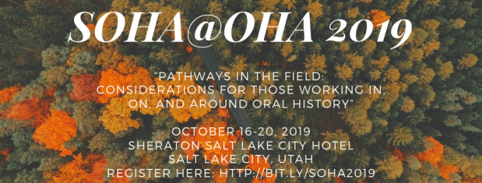 - We are cosponsoring the 2019 Oral History Association conference October 16-20 in Salt Lake City, UT. This means reduced rates for SOHA members. It also means that there will be special SOHA sessions and our annual Awards reception on October 19, which is open to all participants.