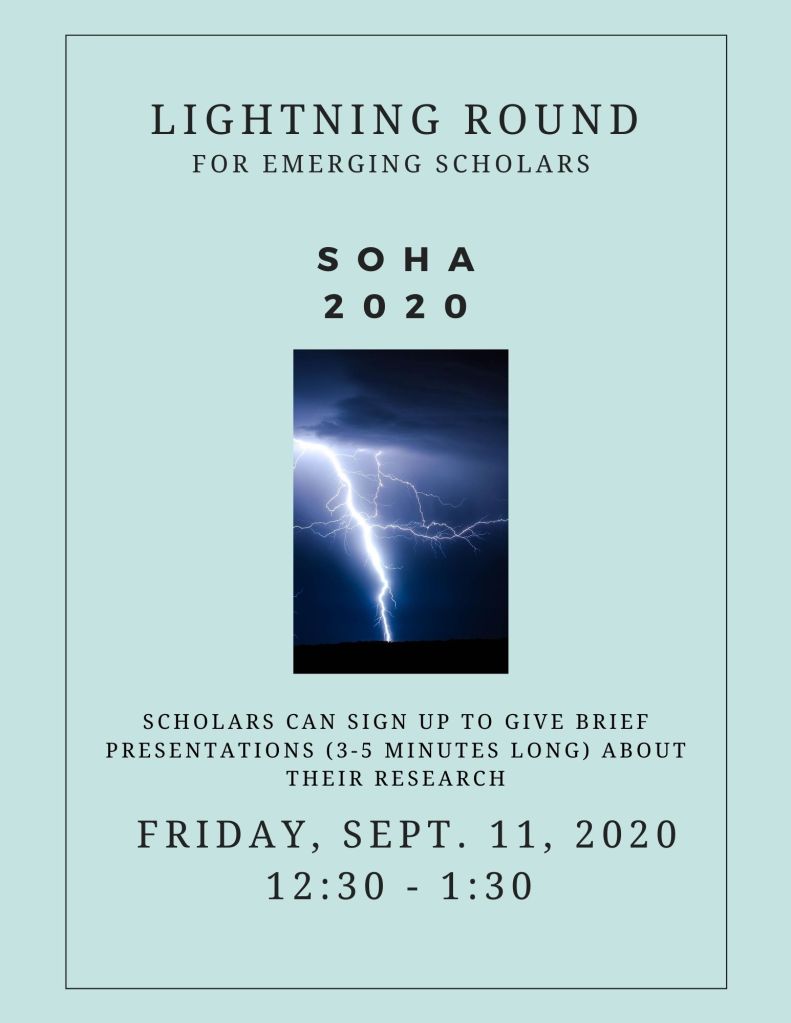 The Lightning Round features new and emerging oral historians. This lightning round is a special session where emerging scholars can pre-register to give brief presentations (3-5 minutes long each) about their oral history research. The session is organized and moderated by SOHA Secretary Dalena Sanderson-Hunter (University of California, Los Angeles) and SOHA 2020 Conference Committee member Brittany Romanello (Arizona State University).