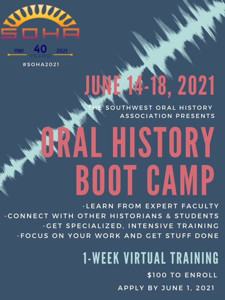 The Southwest Oral History Association is delighted to announce our first virtual oral history boot camp! We invite scholars, students, and oral historians at all levels to join us for this 5-day intensive training. Whether you are new to oral history, or looking for a jolt of energy, this boot camp may be for you!