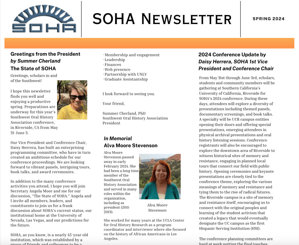 The Southwest Oral History Association will award two or three scholarships to deserving oral historians and practitioners to attend the annual conference which will be held in Riverside, California from May 31-June 2, 2024. Funding will include a cash award of $400 for each recipient, $100 of which will be disbursed prior to the conference, with the balance issued on the final day of the conference. These awards will be applied toward hotel and travel expenses. Free conference registration is included in the scholarship. Additionally, a SOHA member point of contact/mentor for the conference will be provided upon request. Students, teachers, independent oral historians, community oral historians and individuals associated with nonprofit organizations are encouraged to apply.