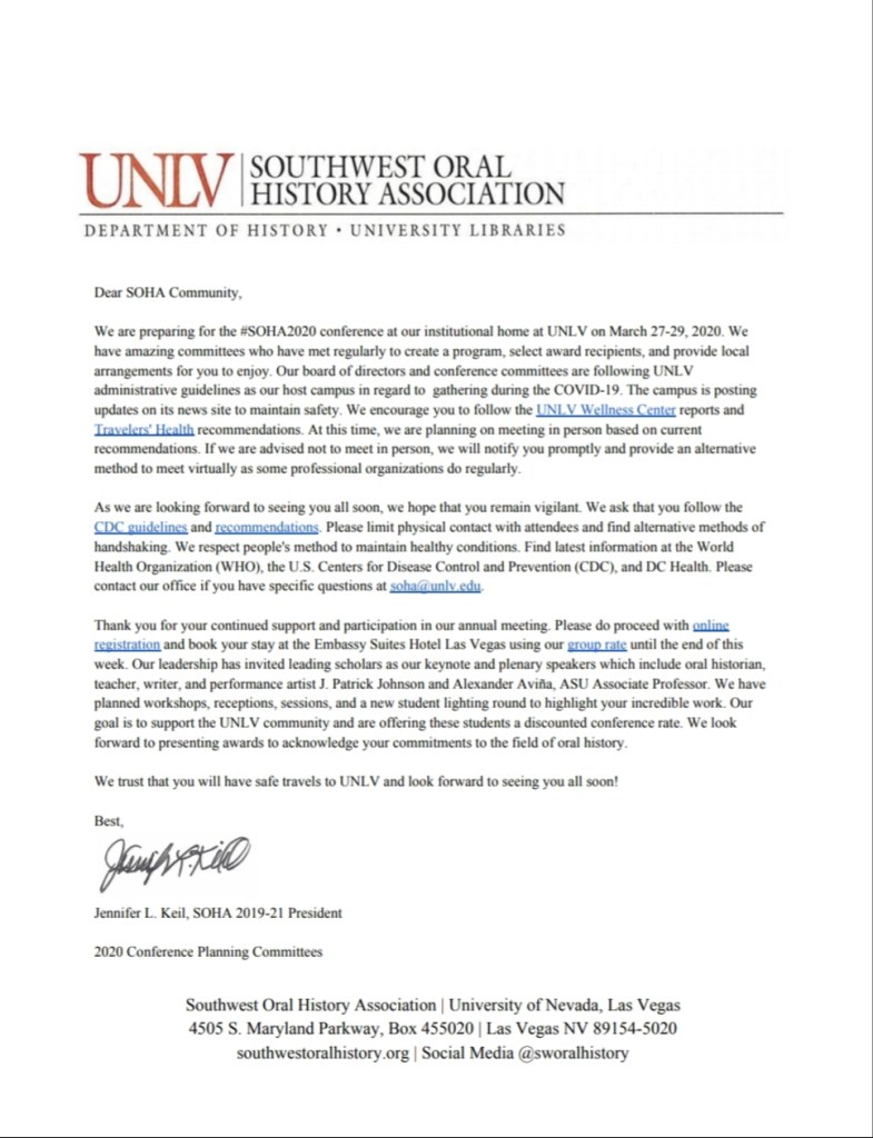 We are preparing for the #SOHA2020 conference at our institutional home at UNLV on March 27-29, 2020. We have amazing committees who have met regularly to create a program, select award recipients, and provide local arrangements for you to enjoy. Our board of directors and conference committees are following UNLV administrative guidelines as our host campus in regard to gathering during the COVID-19. The campus is posting updates on its news site to maintain safety. We encourage you to follow the UNLV Wellness Center reports and Travelers’ Health recommendations. At this time, we are planning on meeting in person based on current recommendations. If we are advised not to meet in person, we will notify you promptly and provide an alternative method to meet virtually as some professional organizations do regularly.