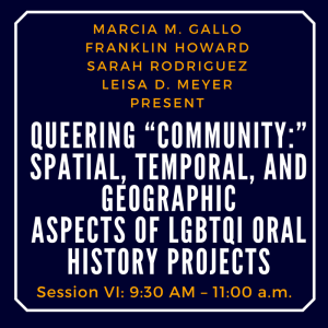 Marcia M. Gallo (Associate Professor of History, UNLV; Co-President, SOHA Board of Directors), Franklin Howard (MA Program, History, UNLV; Graduate Assistant, SOHA), Sarah Rodriguez (History Program, The College of William and Mary), and Leisa D. Meyer (Community Studies Professor of History, American Studies, and Gender, Sexuality, and Women’s Studies) present individual and group oral histories and interviews conducted in the early twenty-first century to reveal local and national networks that predated the conscious creation of queer neighborhoods, organizations, and media in the 1970s and 1980s.This session will explore how the development of identities informed spatial, temporal, and geographic constructions of “communities.” It also explores the impact of visual and textual representations on our communities.