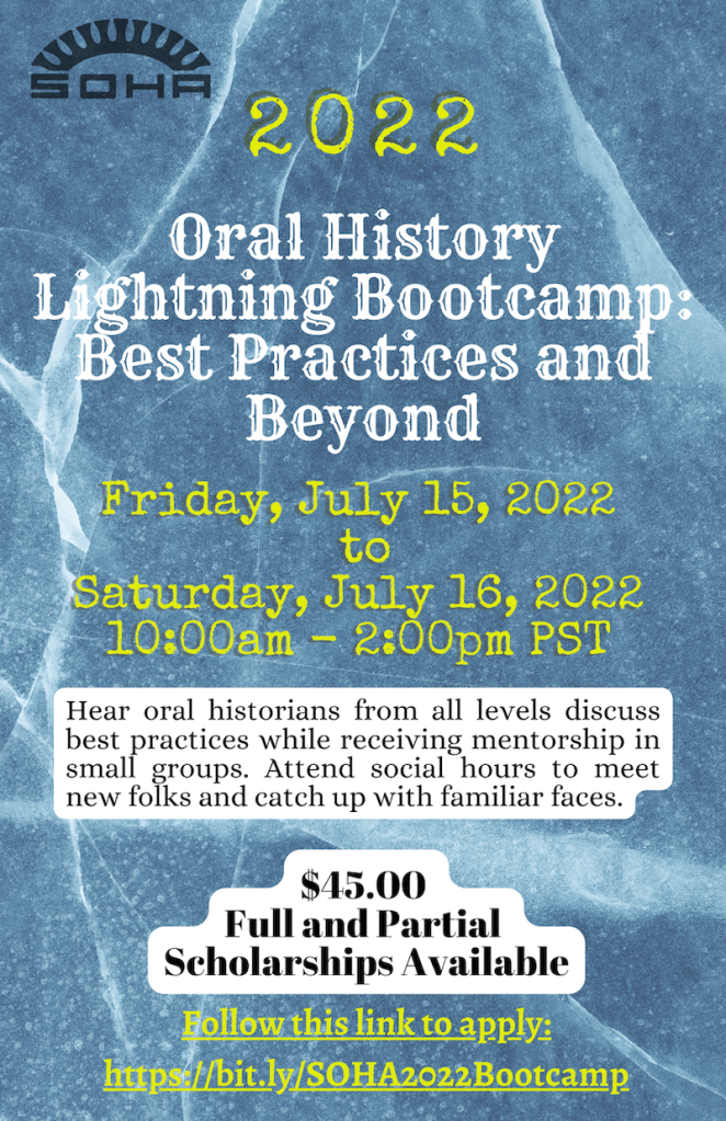 SOHA is hosting our summer oral history bootcamp through Zoom virtual meetings on Friday and Saturday, July 15-16, 2022 from 10 am to noon Pacific Time. This lightning bootcamp will feature conversations, presentations, and panels about best practices in oral history and more. There will be an optional virtual social hour as well, which anyone can attend.